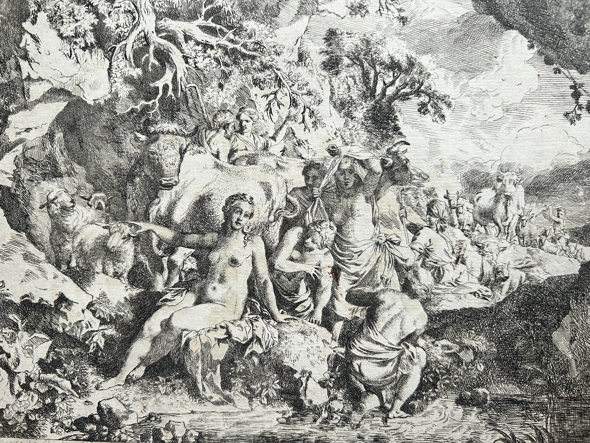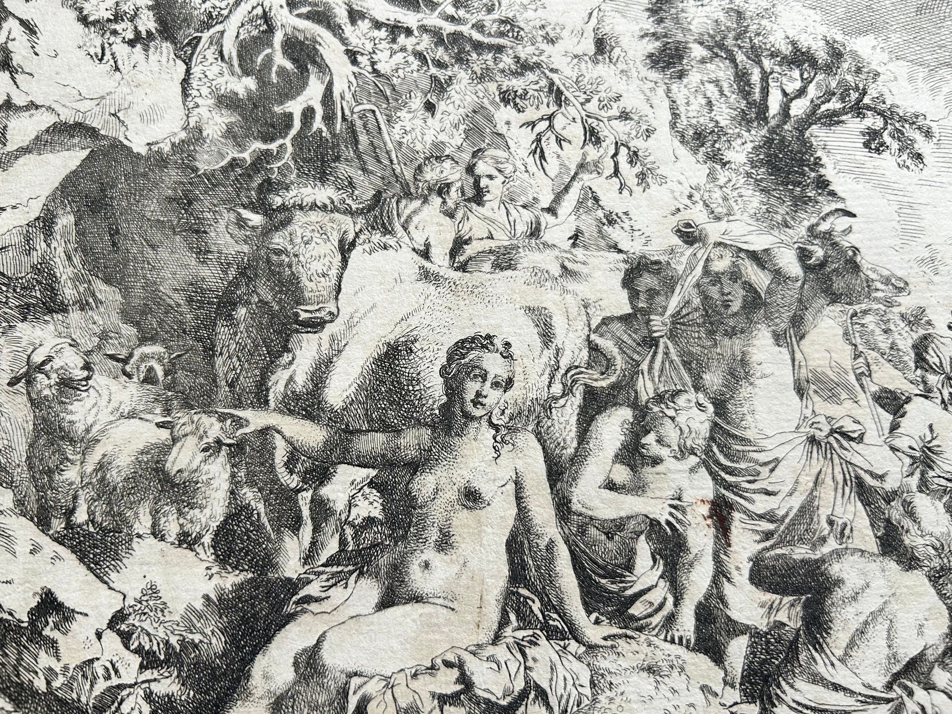 Add a touch of Old Master elegance to your collection with this exquisite etching, Nymphs Bathing in a Cave, by the renowned German artist Christian Wilhelm Ernst Dietrich (1712–1774). This captivating work showcases a richly detailed mythological scene: nymphs resting and bathing amidst a forested cave, surrounded by livestock, attendants, and dramatic natural scenery. The composition reflects Dietrich’s masterful blend of classical influence and baroque drama, reminiscent of artists like Rembrandt and Salvator Rosa.