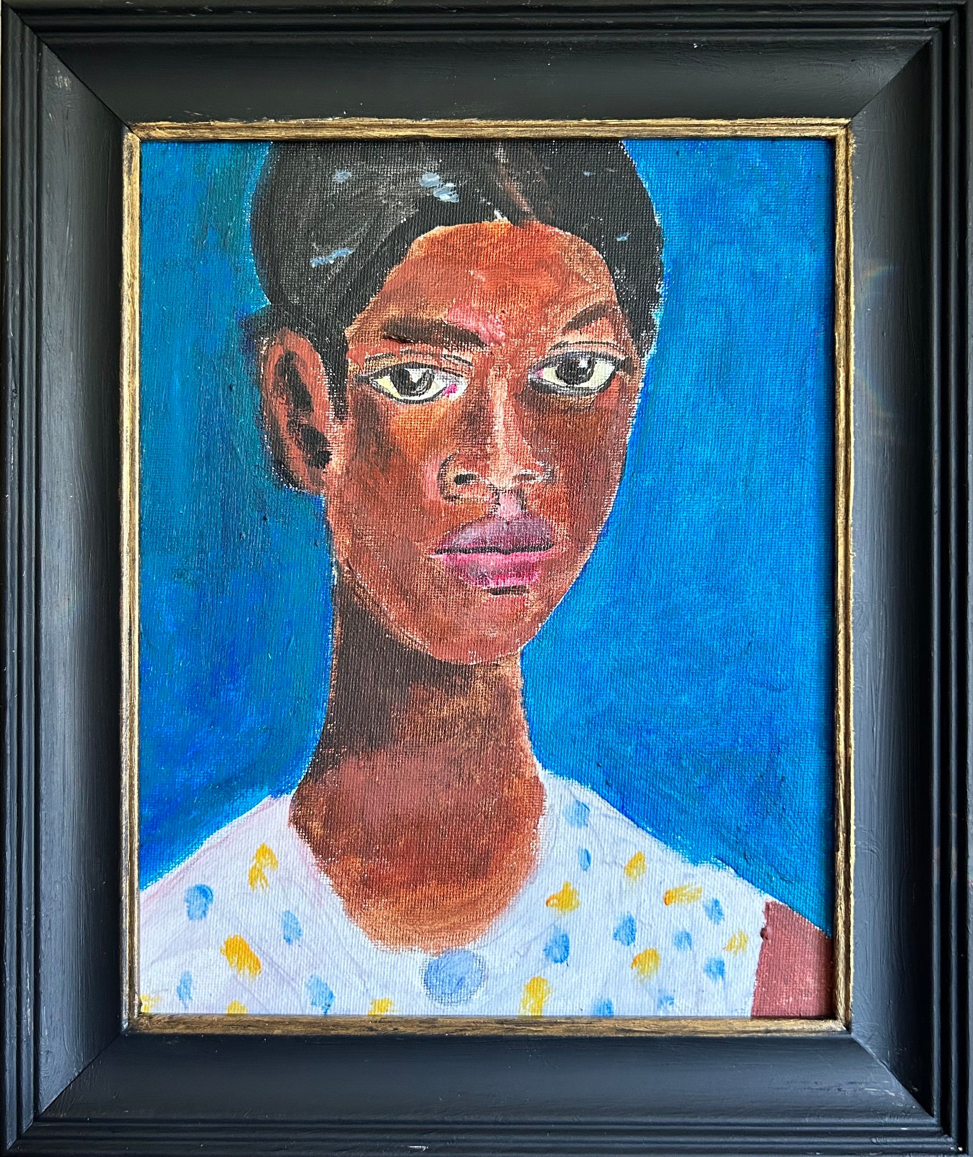 Keywords: original oil painting, 10x8 inch portrait, young Black woman art, contemporary portrait painting, vibrant wall art, framed artwork, unique home decor, expressive portrait, blue background art, art for living room, small oil painting, cultural wall art