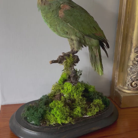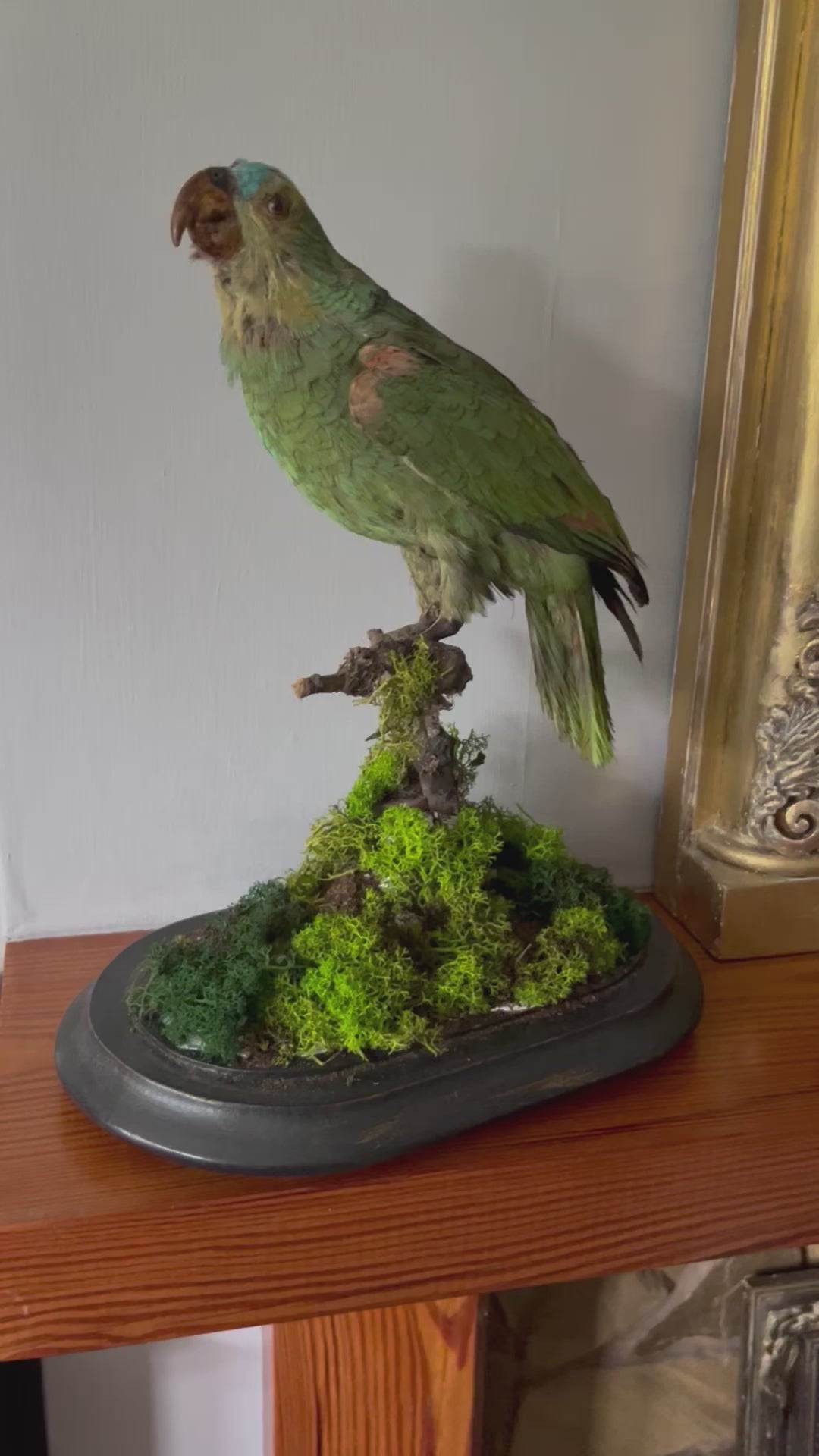 An absolutely stunning Victorian taxidermy Amazon Parrot on a landscaped base within a Victorian glass dome. Incredibly rare to find one of these stunning birds.