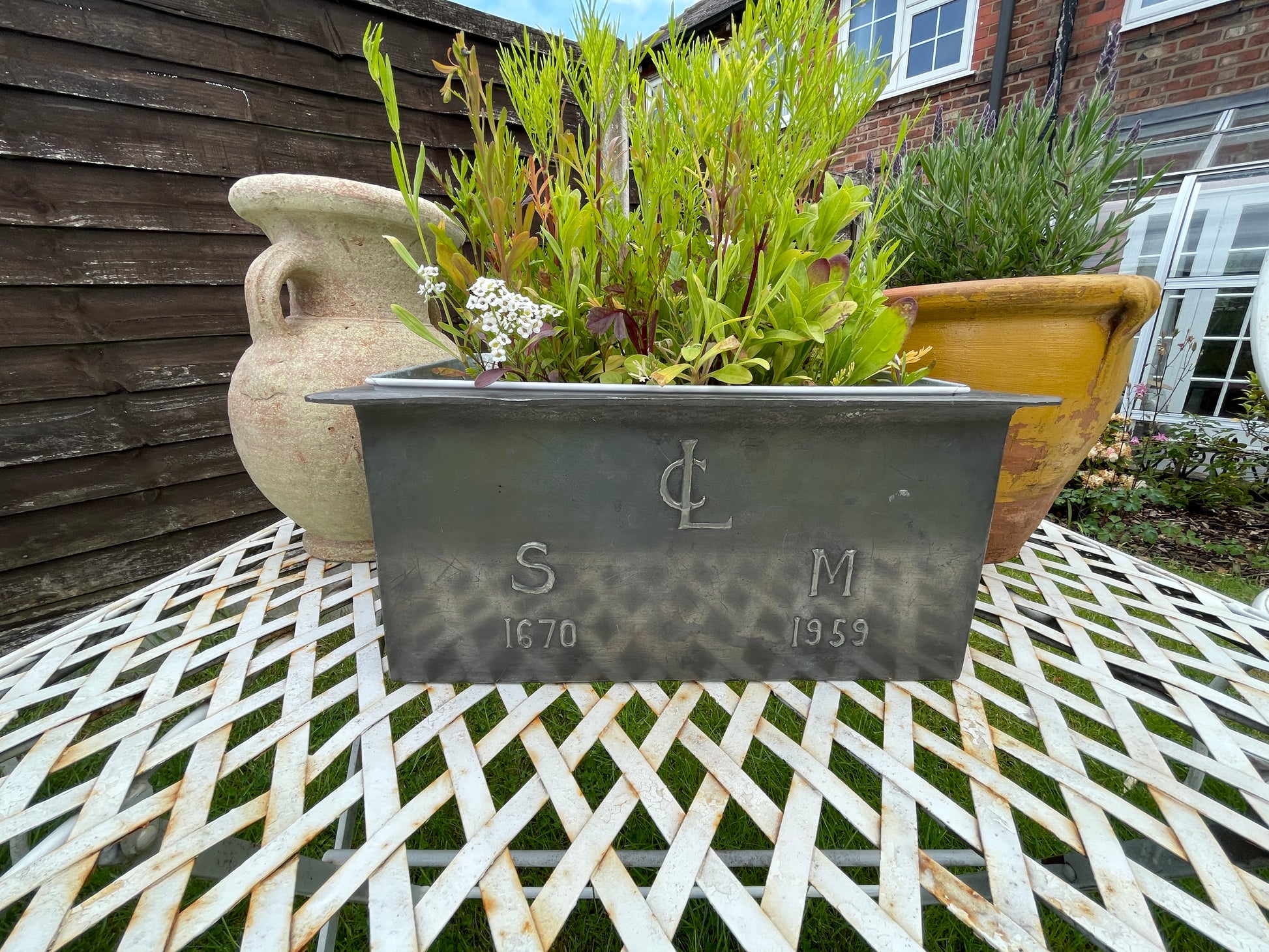 Add a touch of stately charm to your garden with this striking vintage lead planter, beautifully cast with commemorative markings. A timeless piece reminiscent of English country estates, this substantial trough features the dates 1670 and 1959, flanking the bold initials S and M, with a graceful intertwined CL (or LC) monogram at the center.