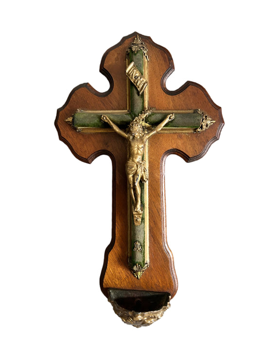 Antique French Crucifix With Holy Water Holder Velvet Covered Cross On Wooden Background Brass Corpus