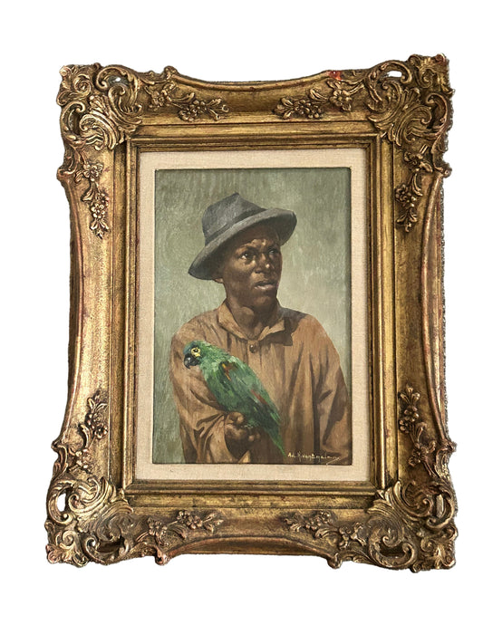 Adrian Henri Vital Van Emelen 1868-1943 Portrait Painting in Oils Of a Man With Parrot
